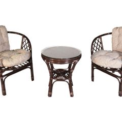 Комплект из натурального ротанга, состоящий из двух кресел и круглого столика с плетеной столешницей. Стекло входит в комплект.